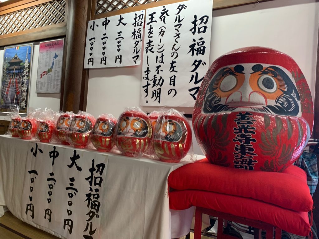 お正月の縁起物の「招福だるま」です。だるまさんの左目にはお不動さんの「梵字」が書いてあります。お持ち頂いたら、まずその梵字を願いをこめて黒く塗りつぶします。願いが叶ったら右目を塗りつぶしてお寺へ納めます。 -